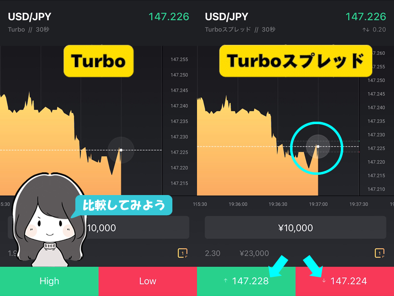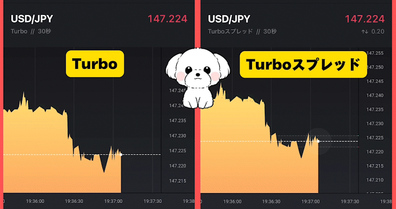 上に画像の例で説明すると、「147.226円」で●Lowにエントリーしたときに普通のTurboだと「147.226円より下がれば勝ち」ですが、Turboスプレッドの場合は「147.224円より下がれば勝ち」となります。