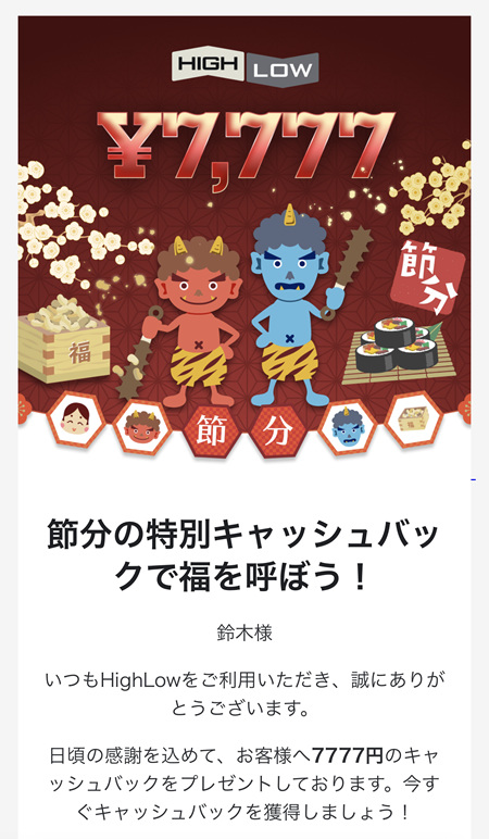 2024年2月1日にこんなメールが届いていました!「節分の特別キャッシュバック7,777円」のプレゼントでした!これはロイヤリティーステータスに関係なく受け取れるようです。詳しく見てみましょう!