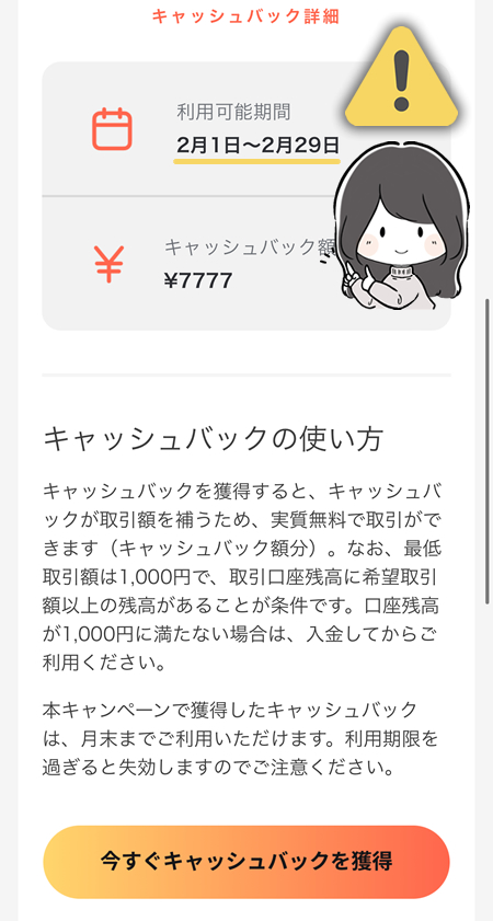 口座残高が1,000円以上ないと7,777円のキャッシュバックは利用できないようですので口座残高が1,000円未満の場合は入金しましょう!